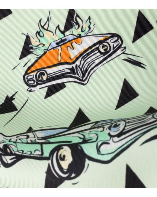 Prada enlivens the classic silk scarf with an unusual archive print. Upon this square design, the recognisable Prada Triangle is overlaid with a dynamic, retro vehicle print, juxtaposing a classic dark hue. Secure it around the neck in your desired fashion for a flash of the pattern.