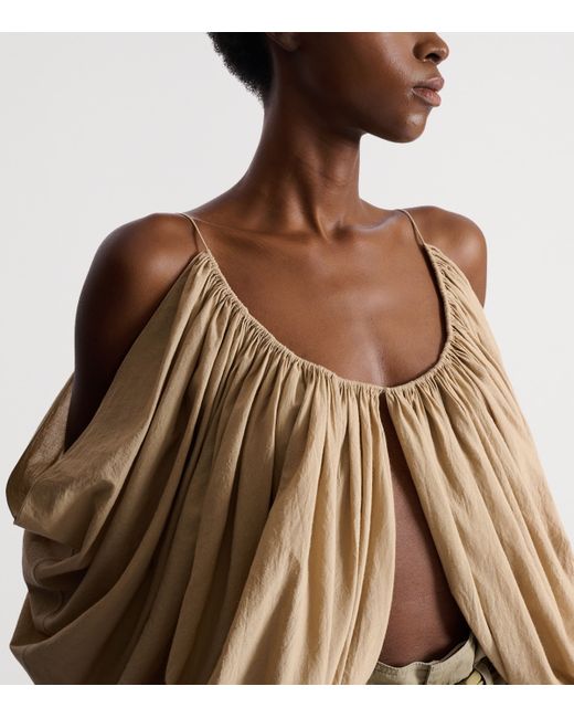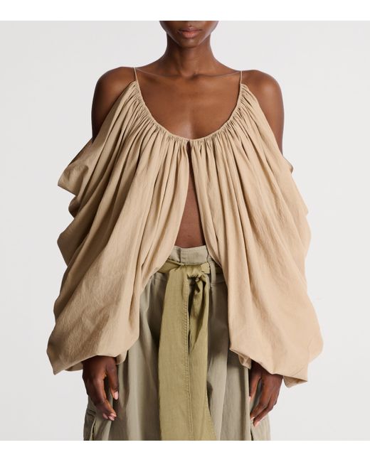 Created for Balmain’s Spring/Summer 2026 collection, this blouse speaks to the flowing waters of the sea. Defined by voluminous folds of cotton, the open-style silhouette breathes with cutout shoulders and a dramatic, navel-baring design.