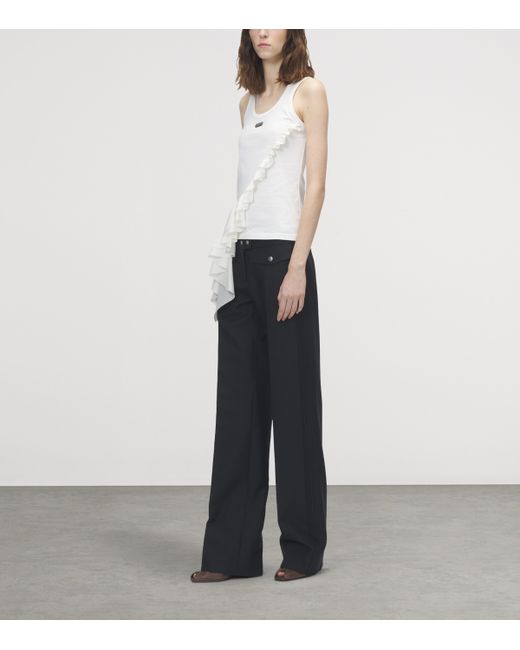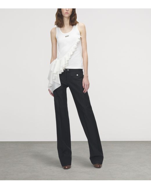 A trail of ruffles hangs asymmetrically across this McQueen tank top, bringing the label’s romantic tendencies to the forefront. The House takes care to maintain the classic design details, such as the scoop neckline and cotton construction, but never misses an opportunity to let its rebellious side shine.