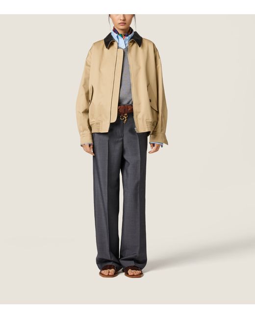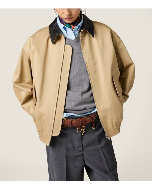 Established in 1993 based on Miuccia Prada’s personal style and interests, Miu Miu is the frivolous younger sister of Prada. This bomber jacket is crafted from cotton that salutes the label’s love for a vintage finish, yet also embraces a contemporary attitude with the contrasting leather collar.