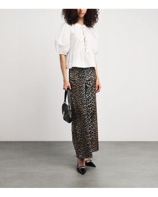 ganni is a master of unique style, offering endless alternatives to traditional tailoring and evening wear. This peplum blouse is a romantic statement-maker with a Copenhagen-inspired twist, finished with delicate bow detailing and puffed sleeves that contrast beautifully with straight trousers.