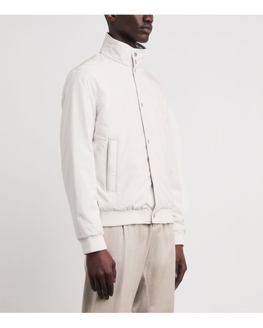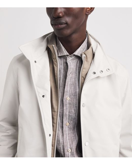 Typhoon Platinum is Paul & Shark's most advanced fabric – breathable, windproof and waterproof without the bulk. This jacket adds a detachable front panel with its own ribbed under-collar and zip, giving two distinct configurations in one piece, with Alcantara-trimmed zip pockets, the ribbed hem and cuffs and a metal Shark Fin badge completing the construction.