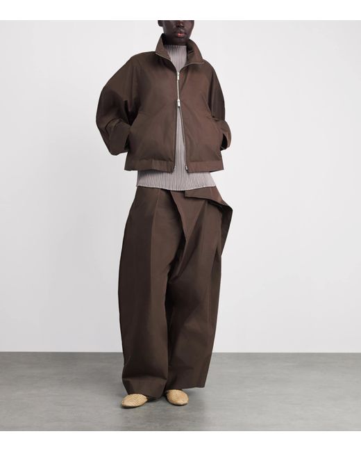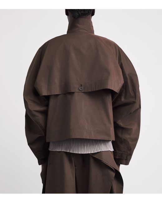 Under creative director Satoshi Kondo, Issey Miyake continues its legacy of fabric innovation through pieces such as the Akimbo jacket. Featuring a high neckline and exaggerated storm shield, its voluminous silhouette comes courtesy of structured taffeta, which is woven with Japanese washi paper for lustrous structure.