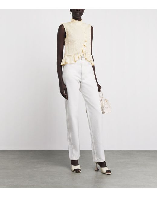 This smocked top from Sandro nods to the label’s instinct for moving to its own rhythm, emphasising fluid lines and layered texture. Ruffle detailing defines the sleeveless silhouette, beginning at the stand collar before cascading asymmetrically down the bodice and circling the hem with soft, sculptural motion.