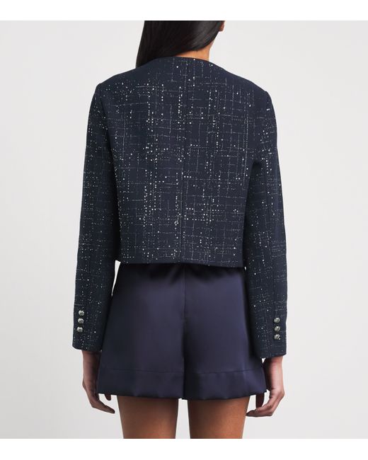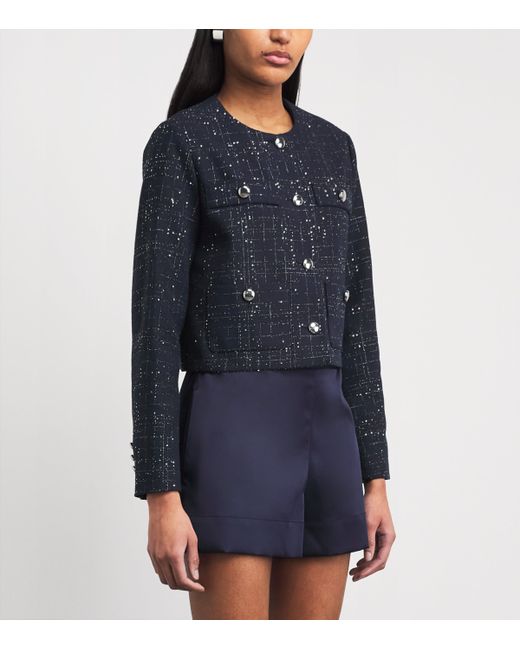 Brand aficionados will recognise Maje’s flair for rule-breaking glamour, continually refreshing timeless silhouettes with modern expression. Here, the Parisian label reimagines its signature cropped jacket with shimmering sequin embroidery, capturing the light with ease and dazzling from every angle.