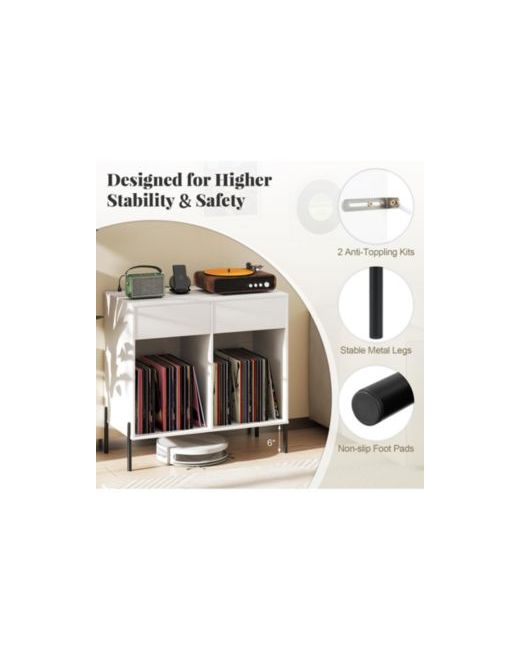 Elevate your audio experience with this versatile record player stand, featuring a spacious tabletop, two drawers, and customizable vinyl storage. A built-in charging hub keeps devices powered, while its sturdy metal legs and anti-toppling kits ensure stability. The elegant wood grain design adds a touch of sophistication to any room.