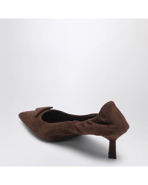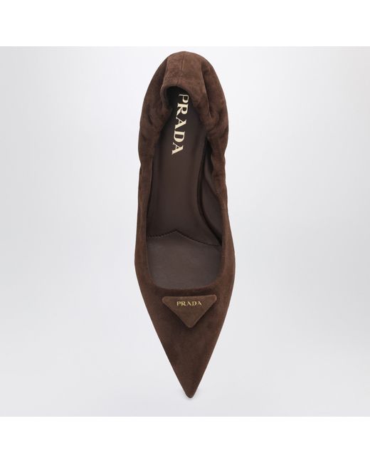 Prada pumps in cocoa-colored suede featuring pointed design soft tapered silhouette elastic back leather-covered architectural heel front triangle logo plaque with printed logo lettering and leather sole.