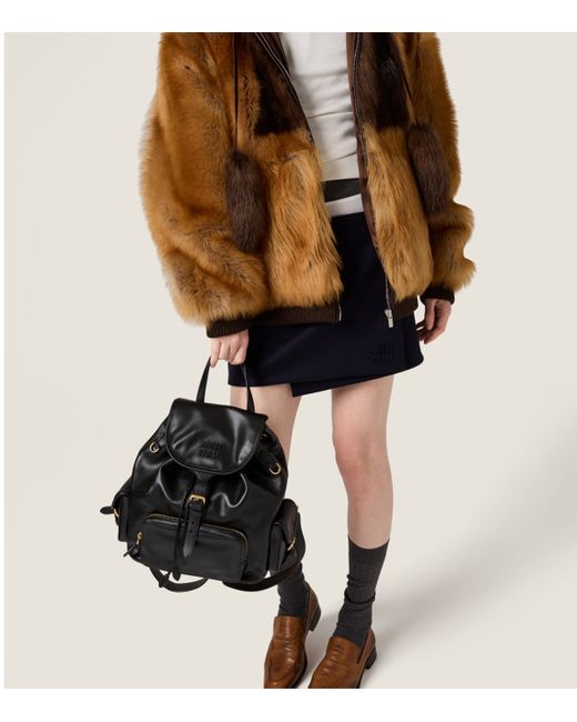 A head-turning finishing touch, this blouson jacket expresses Miu Miu's contemporary take on femininity. The plush shearling composition – presented here in caramel and dark brown – not only provides immense warmth but channels the image of a mountain wardrobe, one of many sources of inspiration for Miuccia Prada during the design process.