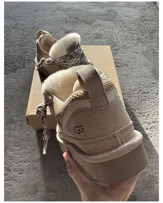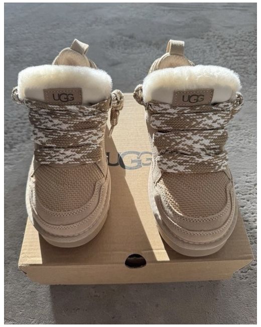 The UGG Lowmel Sand is a stylish women's trainer with a low top shoe shaft style and lace-up closure for a secure fit. Made with sheepskin lining and a rubber outsole, these sneakers offer comfort and stability, perfect for casual occasions during the winter season. The beige suede upper and logo accents add a touch of sophistication to the UGG Classic product line, making them a versatile and fashionable choice for everyday wear.
