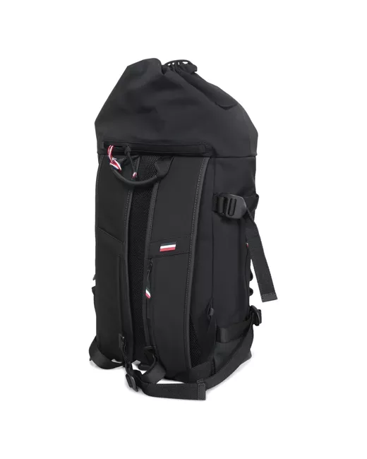 black logo-embossed drawstring fastening adjustable padded shoulder straps single top handle side buckle-fastening straps rear zip-fastening pocket mesh back panel