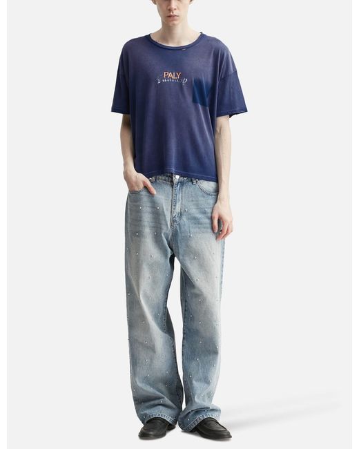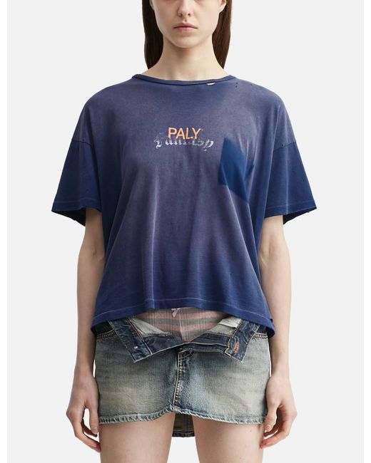 PalyCore Logo TeeUnisexBoxy cropped fitVintage textured Japanese jersey fabricHeavy vintage wash process left with a ghost chest pocketHand distressing at neck, hem, and bodyRibbed round neckShort sleevesLogo print at frontMade in Los AngelesColor: Navy