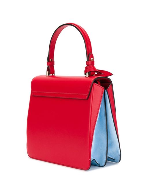Red and blue flip handbag, top portable, metal ring design, label watch strap details, flip, with mezzanine inside.