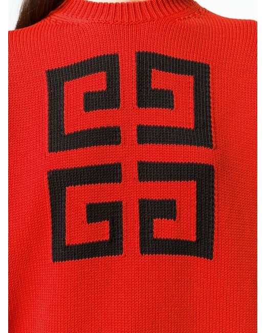 Red cotton round neck sweater with large black 4G badge on the front and black GIVENCHY PARIS logo on the back. Rib collar, hem and cuffs.