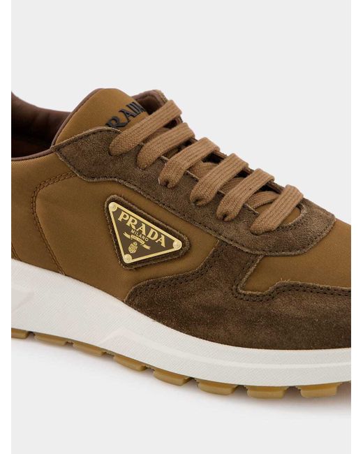 Front lace, enameled metal triangular logo and embossed Prada Milano logo.