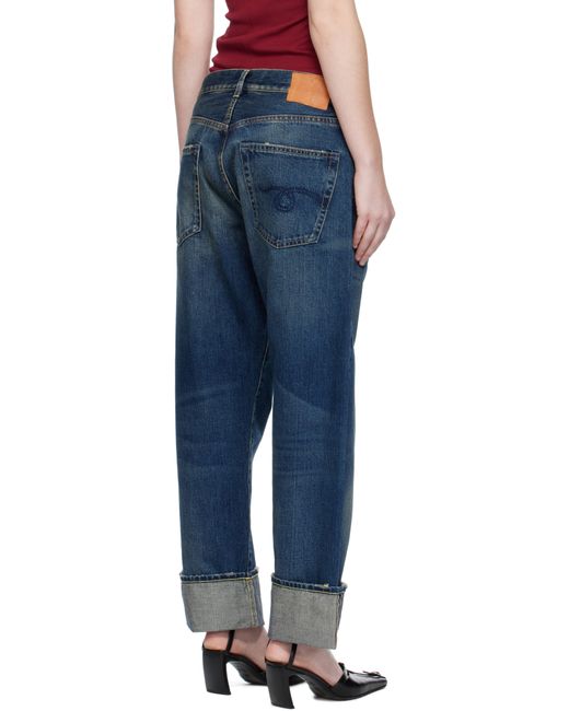 Straight-leg, non-stretch denim jeans with sewn-on ears featuring fading, whiskering, and distressing details. These jeans feature belt loops, five-pocket styling, a zip fly, and rolled cuffs. They also feature a leather logo patch at the back waistband, logo-engraved antiqued copper hardware, and contrast stitching in beige and tan.