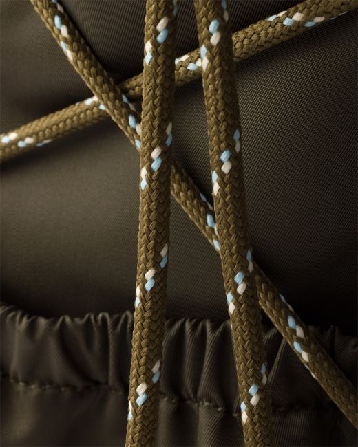 Adjustable fabric seatbelt, enamel metal triangle logo on the front, drawstring, flap and side snap closure, four external zippered pockets and two drawstring water bottle pockets, padded mesh back, internal zippered pocket and double patch pockets.