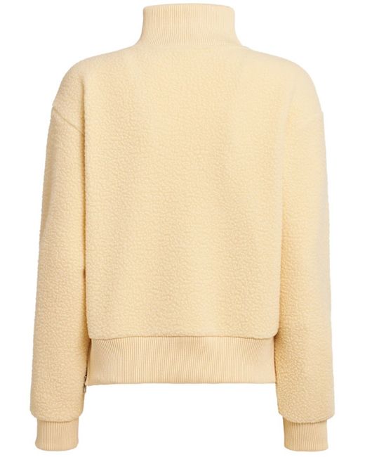 The front is closed with a half zipper, has a high collar, long sleeves, and ribbed trim.