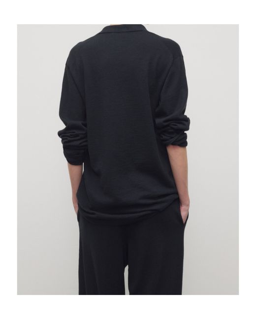 Long-sleeved polo top in lightly textured melange cotton with oversized fit, buttonless front tab, and clean edge finish with covered stitch detailing.