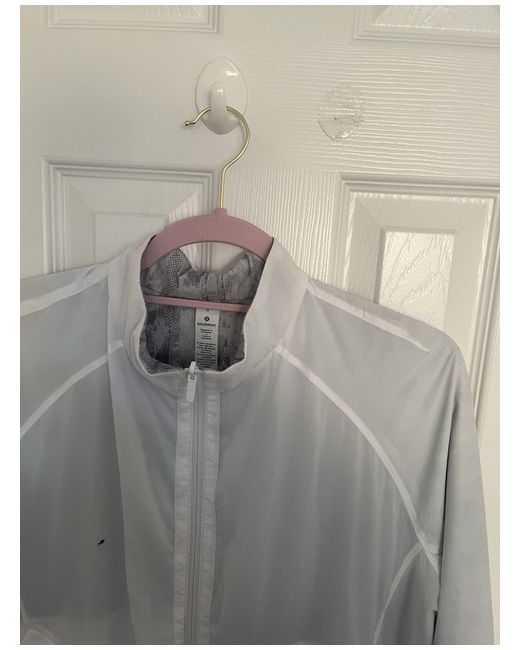 The Lululemon Bombs Away Reversible Jacket in white is a versatile and stylish activewear piece designed for women. Made with a blend of nylon and polyester, this long-sleeve jacket features a zip closure and is machine washable for easy care. The reversible design allows for multiple styling options, making it perfect for yoga or other springtime activities. The sports-themed jacket is part of the Lululemon Define product line, offering both style and functionality for the modern woman on the go. has a small black pen mark that will come off in wash us8 uk12