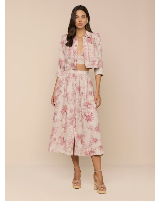 Our classic shirt jacket, now in summer-ready linen. Pair the Eda with the matching bralette and skirt or layer it over a bodysuit and your favorite jeans. • Linen• Lined• Shoulder pads• 1/2 length sleeves• Snap buttons L'AGENCE Eda Cropped Linen Jacket In Tan Multi Textured Jungle Toile